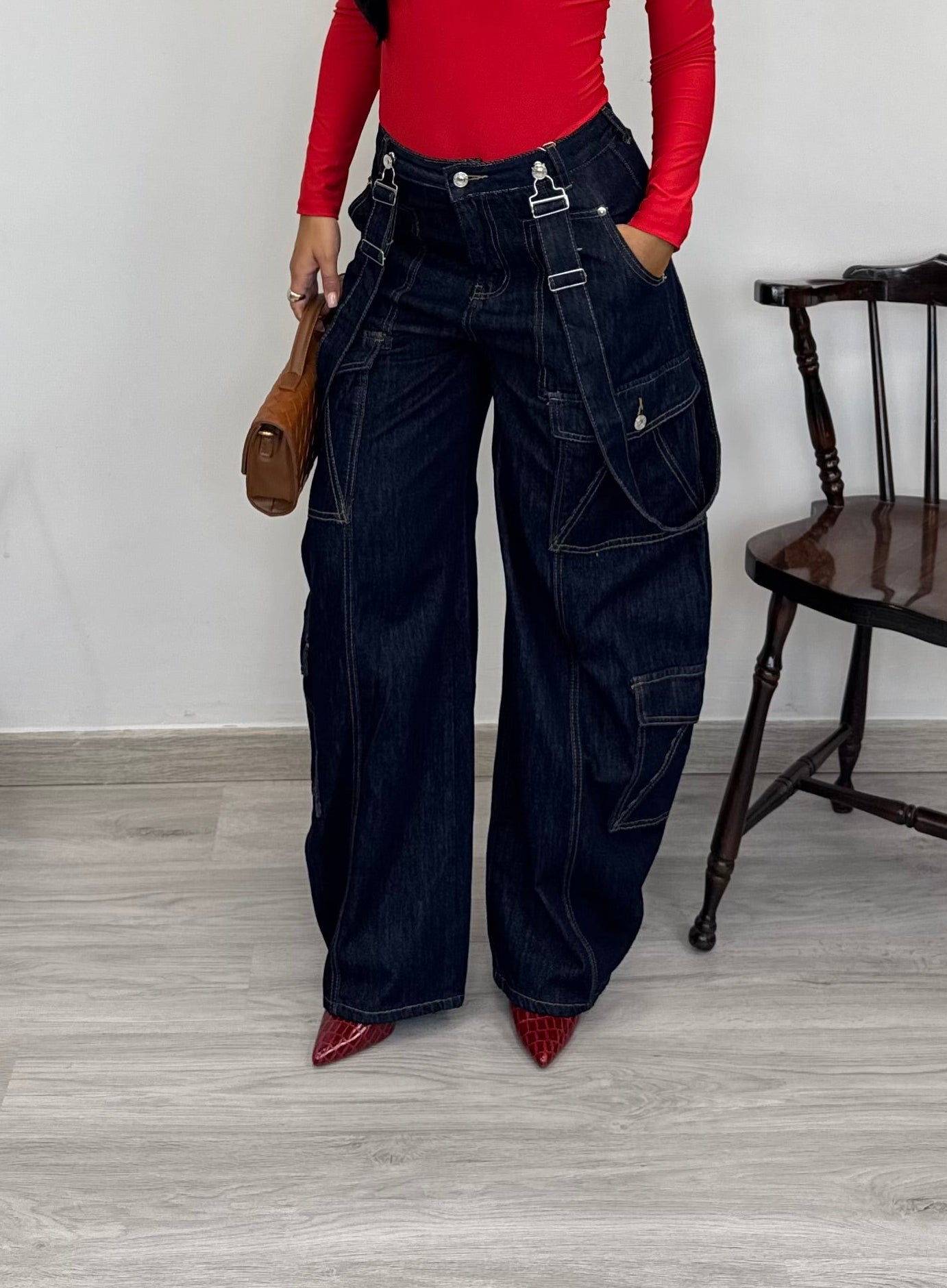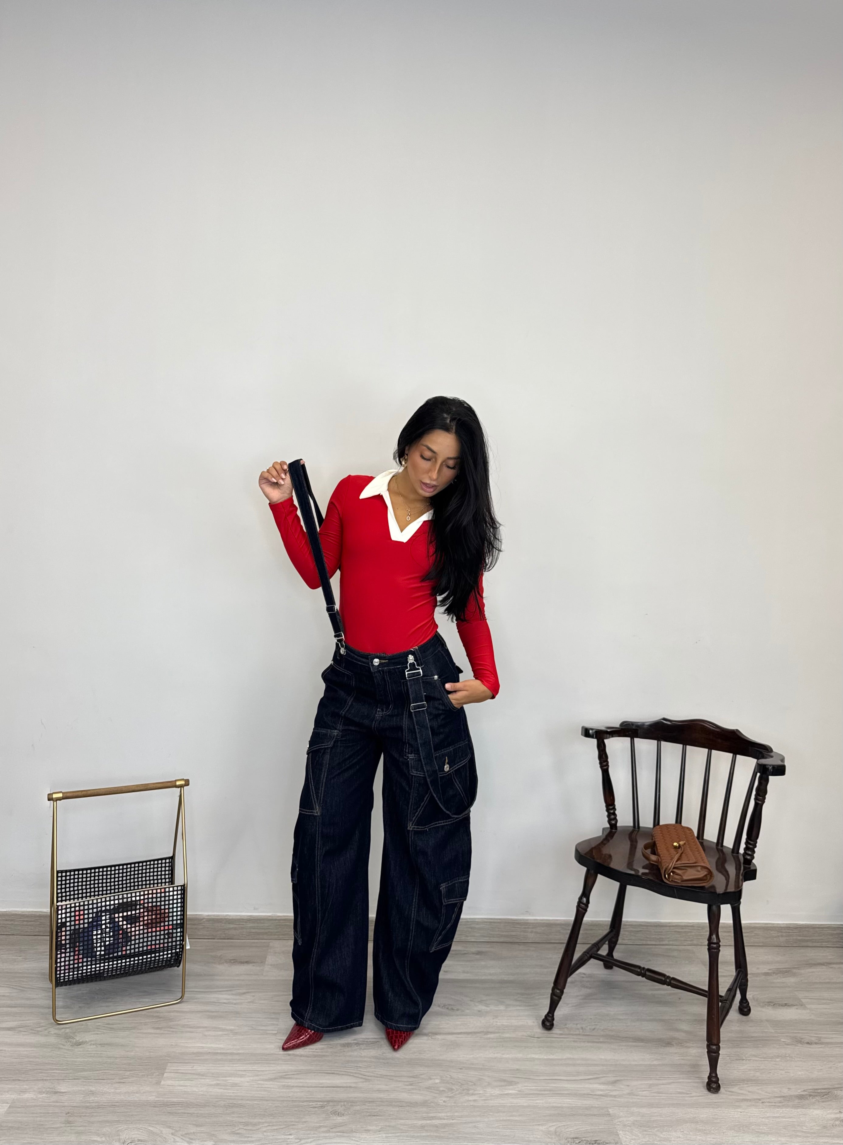 - Jeans con tasconi e bretelle rimovibili